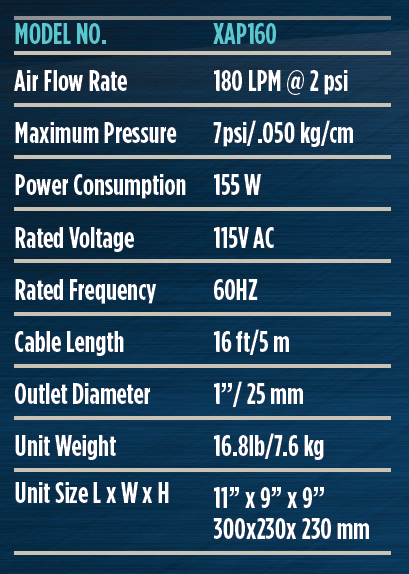- Quiet operation - Outer industrial plastic casing and air baffle, and extra buffer chamber on outlet for exceptional low noise rating.