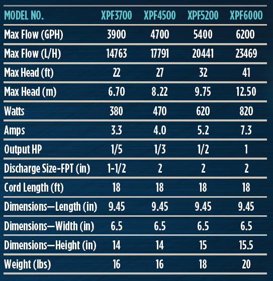 The XPF Series pumps are high volume, direct drive submersible pumps, constructed of heavy duty materials which makes them great for demanding applications, with a capacity to handle up to 3/4″ solids and are typically used for large fountains, ponds and other applications.